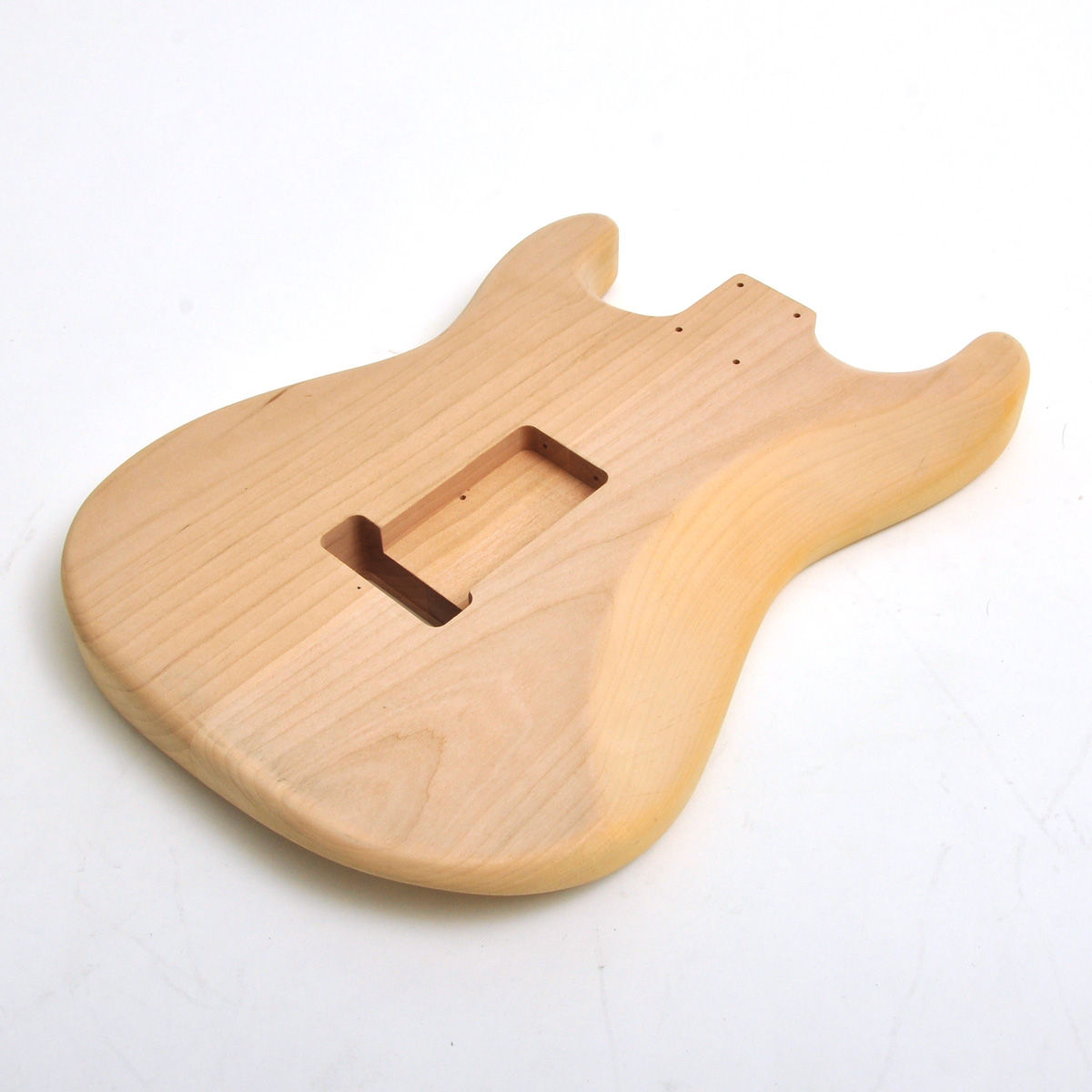 American Red Alder (US-Erle), gefräst für 3 Singlecoils und Vintage Tremolo mit 56mm Schraubenabstand (gemessen Mitte zu Mitte der äußeren Löcher), 61´s Vintage Shaping. Die Löcher für 4 Halsbefestigungsschrauben sind gebohrt.